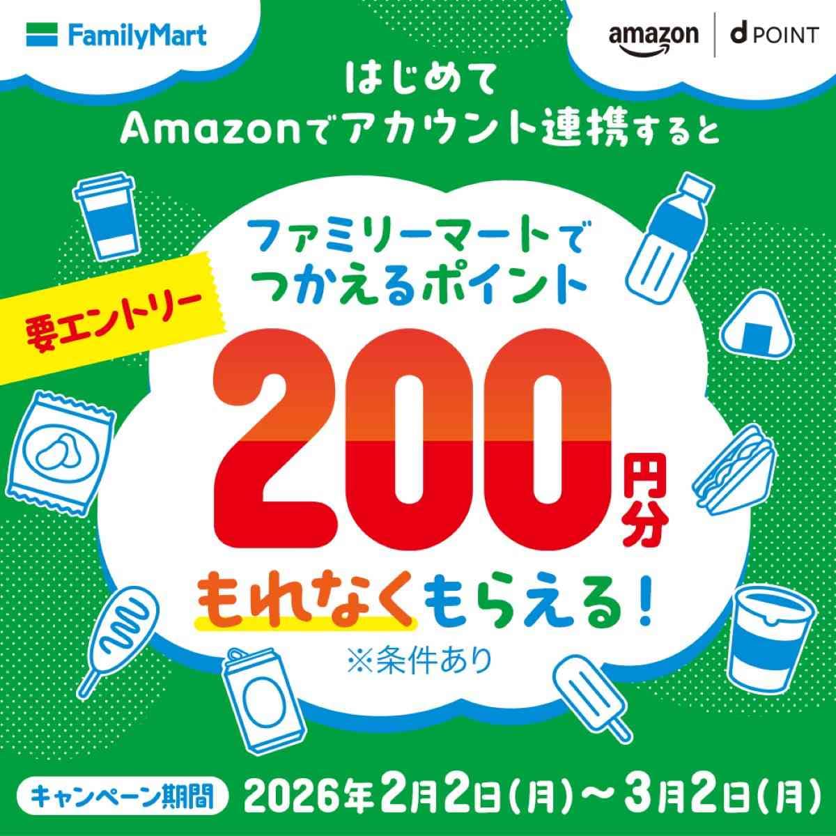 株式会社NTTドコモは、2026年2月2日(月)から3月2日(月)まで、「Amazonではじめてアカウント連携すると、ファミリーマートで使えるポイント200円分がもらえるキャンペーン」を実施しています。  このキャンペーンは、キャンペーンサイトからエントリーし、Amazonアカウントとdアカウントをはじめて連携した方を対象に、期間限定ファミマポイントまたはdポイント(期間・用途限定)200ポイントが進呈されるのだそう。  引用元:PRTIMES(https://prtimes.jp/main/html/rd/p/000000721.000118641.html) ドコモがファミマで使えるポイントキャンペーンを実施 ポイントの種類は、連携完了後2~3日以内にキャンペーンサイト上で選択できます。特典の選択期間は2026年2月2日(月)から3月21日(土)までとなっており、1つのdアカウントにつき特典の進呈は1回限りです。 期間限定ファミマポイントは選択後すぐに利用可能となり、dポイント(期間・用途限定)は3月31日(火)までに進呈されます。  DATA dポイントクラブ┃Amazonでdポイントがたまる!つかえる!ファミリーマートで使えるポイント200円分もれなくもらえる!キャンペーン ※1 本キャンペーンは、予告なく内容の変更や早期終了となる場合があります。  ※2 キャンペーンの詳細は、特設サイトにて確認できます。  ※3 Amazonアカウントとdアカウントの連携は、専用ページから行うことができます。 ※4 エントリーとアカウント連携の実施順は問われません。 ※5 各特典の獲得方法や仕様の詳細については、キャンペーンサイトで案内されています。なお、特典の選択期間は2026年2月2日(月)から3月21日(土)までです。 ※6 1つのdアカウントに対して複数のAmazonアカウントを連携した場合でも、特典の選択は1回限りで、進呈されるポイントは最大200ポイントまでとなります。 ※7 期間限定ファミマポイントは、特典選択後すぐにギフトコードの確認およびファミペイアプリでのポイント交換が可能です。dポイント(期間・用途限定)は、2026年3月31日(火)までに進呈されます。   ※8 期間限定ファミマポイントは、上限数に達した場合、配布を終了する可能性があります。 ※ 本キャンペーンは、株式会社NTTドコモが主催しています。 ※ AmazonおよびAmazon.co.jpは、Amazon.com, Inc.またはその関連会社の商標です。 ※ 「dアカウント」は、株式会社NTTドコモの登録商標です。  ※記事内における情報は原稿執筆時のものになります。店舗により取扱いがない場合や、価格変更および販売終了の可能性もございます。あらかじめご了承ください。